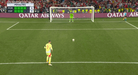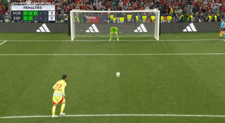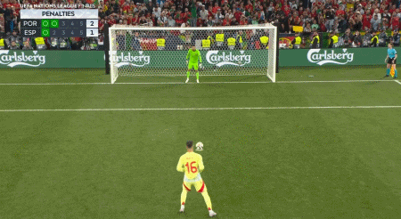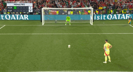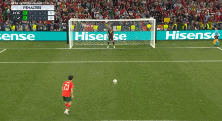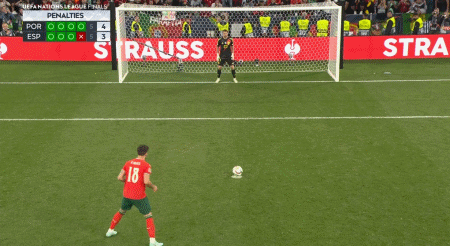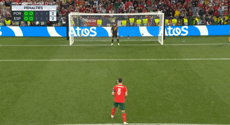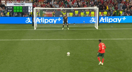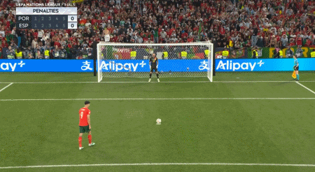 点球大战中,葡萄牙队先罚。第一轮,贡萨洛·拉莫斯和梅里诺王人罚中,1比1。