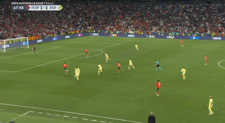 第21分钟,西班牙右路发动进犯,亚马尔送出斜传,鲁本·迪亚斯突围没踢远,内维斯突围作假,苏比门迪将球打进,西班牙1比0取得逾越。