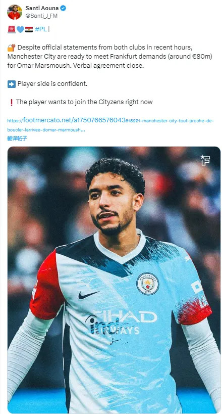 法媒Footmercato名记Santi Aouna跟进,曼城照旧准备好兴隆法兰克福8000万欧的要价。