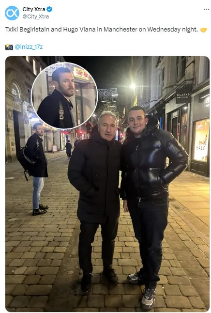 本日,有球迷在曼市街头偶遇了曼城现任总监贝吉里斯坦,曼城的新总监维亚纳(图中圆圈的男东谈主)也出当今了相片里。