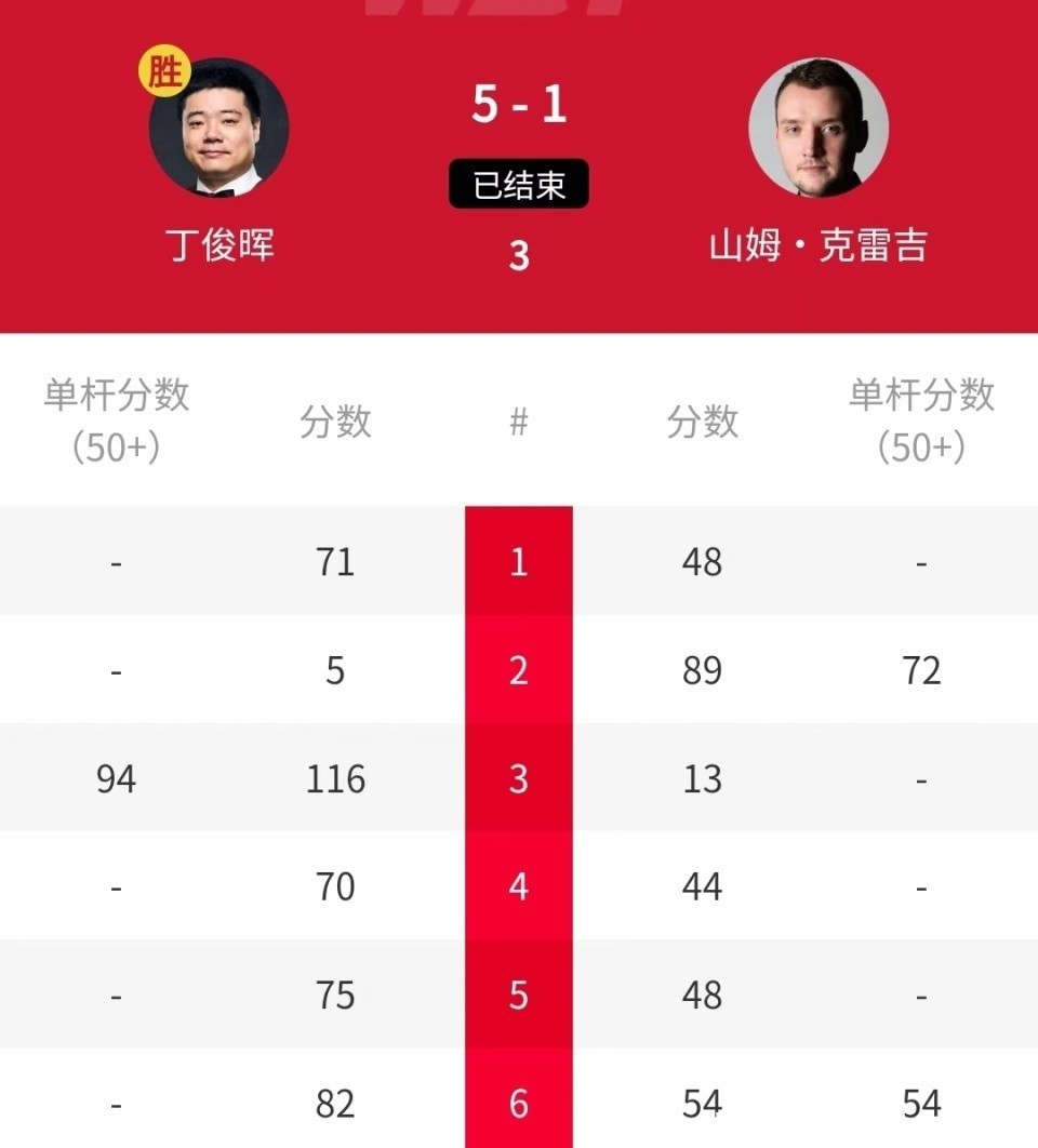 这场比赛第一局,丁俊晖与克雷吉伸开拉锯战,胶著的比赛中,丁主任通过几次上手,71-48先拔头筹,1-0朝上。第二局,克雷吉打出单杆72分,89-5扳回一局,比分追成1-1。第三局,丁俊晖回敬单杆94分,116-3任意赢下,2-1再次朝上。