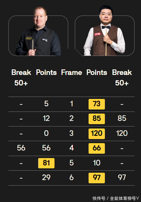 第四局,两东说念主再次伸开拉锯战丁俊晖以70-44赢下,比分来到3-1。第五局。苟简的局间休息回首之后,两东说念主打得依旧荒谬胶著,丁俊晖以75-48再胜一局,比分上风扩大到4-1并赢得三个赛点,克雷吉被逼入绝境。