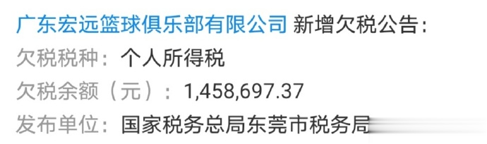 配文:东莞税务局发布信息,广东宏远篮球俱乐部欠税145.8万元,欠税税种是个东谈主所得税。这应该是给原土球员发薪的应缴税款,而CBA外助发薪触及更多詈骂住户企业所得税。现时的民企俱乐部王人辞让易,且看且爱戴。