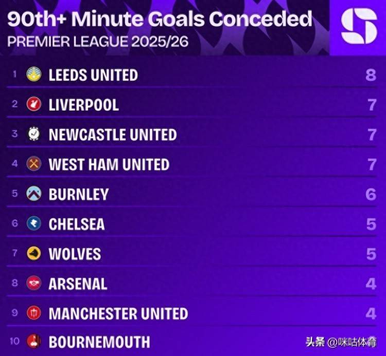 本赛季英超90分钟或以后丢球榜:利兹联——8利物浦——7纽卡——7西汉姆——7伯恩利——6切尔西——5狼队——5阿森纳——4曼联——4伯恩茅斯——4独家看英超就在咪咕沙巴体育网体育信息