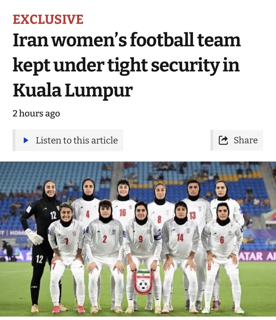 北京本事3月12日,据《伊朗海外报》报谈体育集锦,伊朗女足国度队的成员在马来西亚吉隆坡的一个酒店里受到严实的安保。