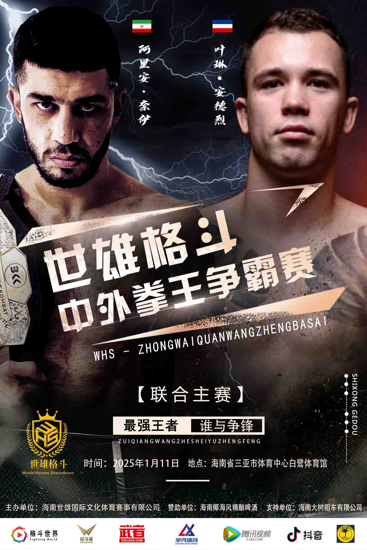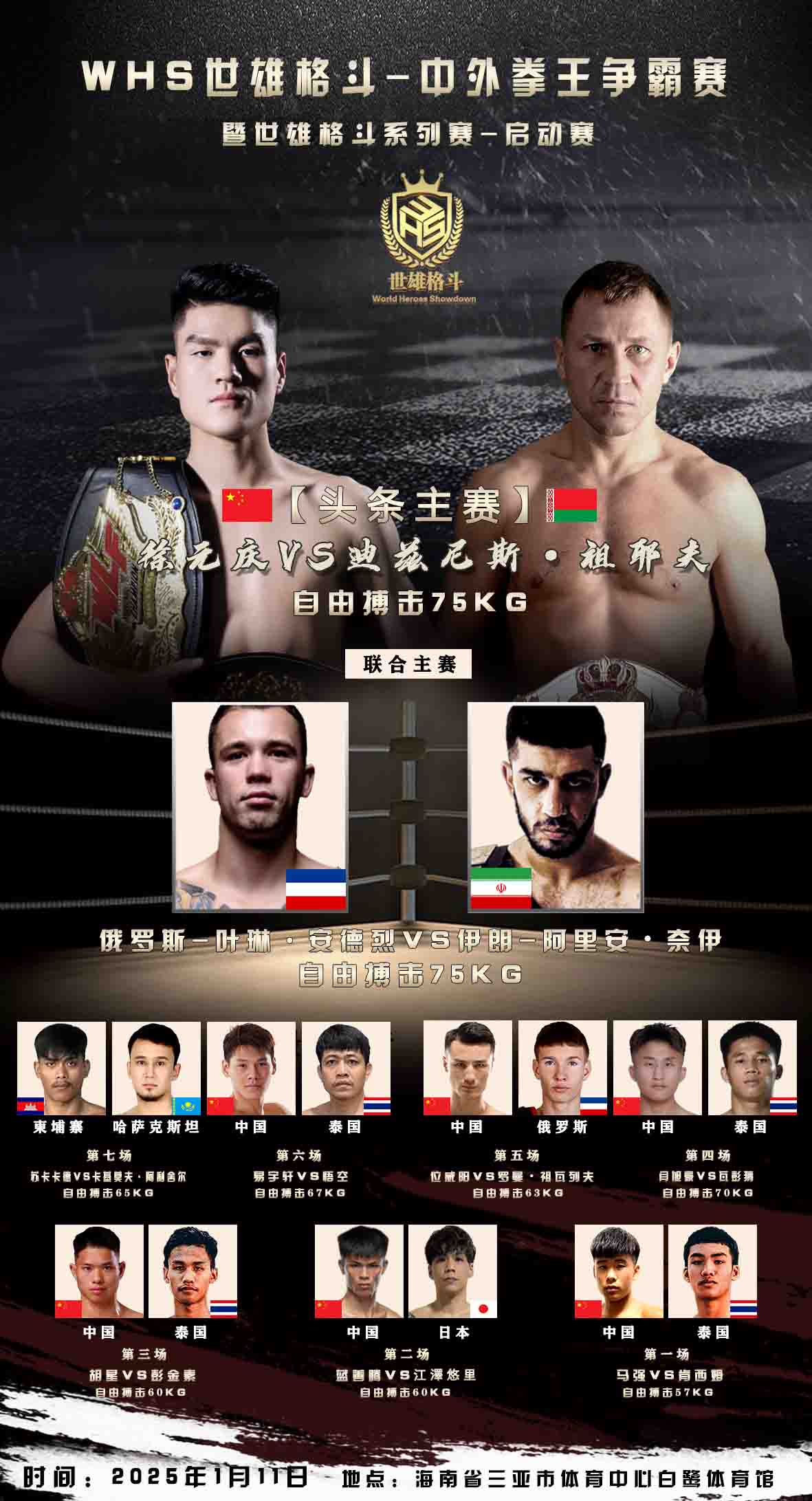 2025年1月11日,WHS世雄格斗中外拳王争霸赛将在海南省三亚市无垠举行。本次赛事由海南世雄国外文化体育赛事有限公司旁边,由海南椰海风精酿啤酒特约补助,本赛事得到了三亚大树汽车租借有限公司、海旅免税城等单元荒谬维持。