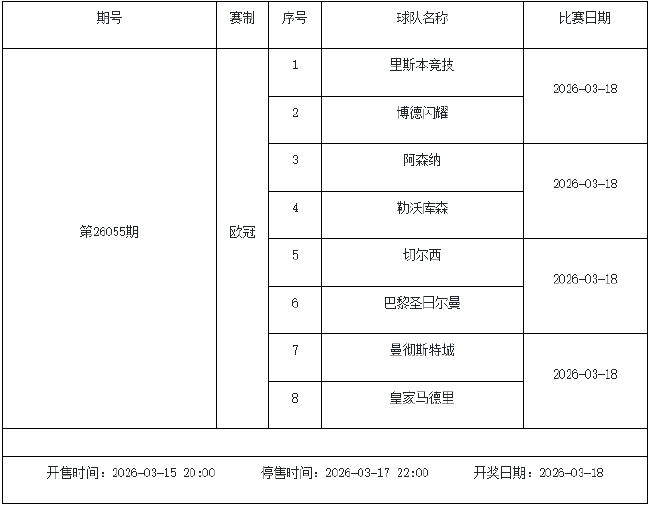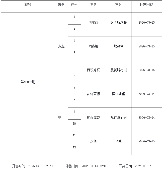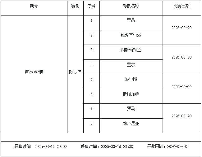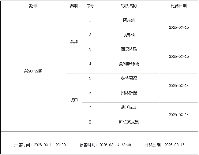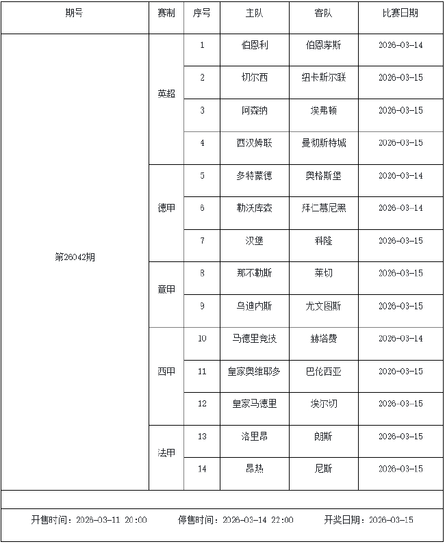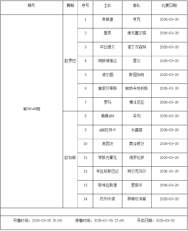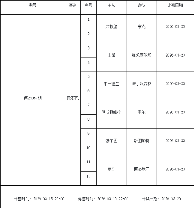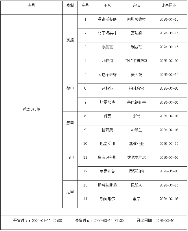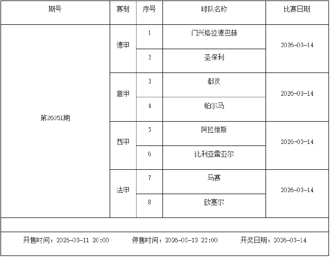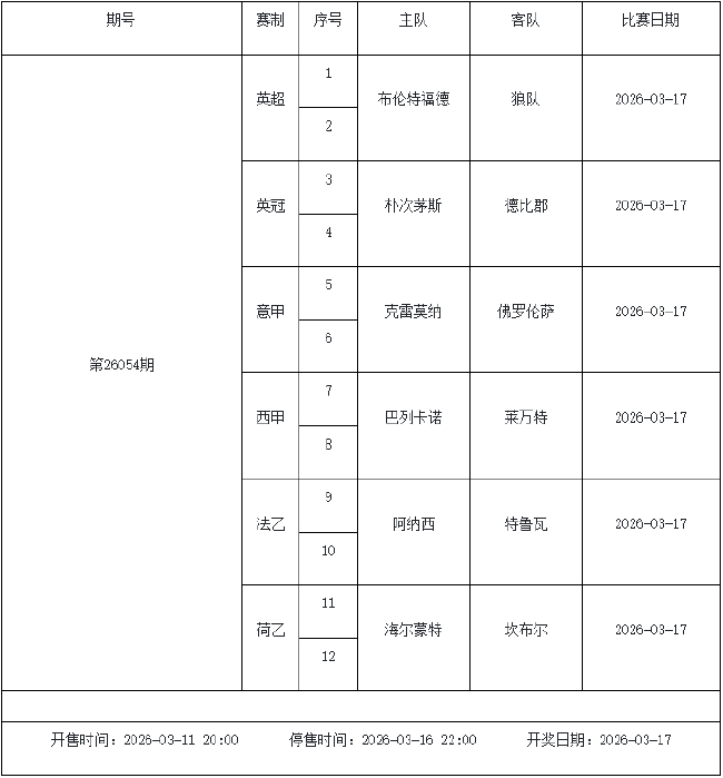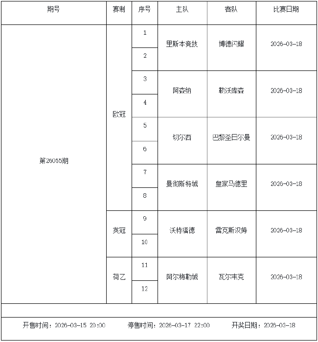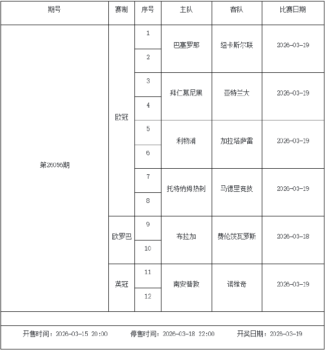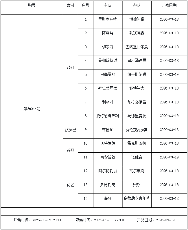 我中心制定了2026年中国足球彩票赢输游戏(14场、任选9场)、6场半全场赢输游戏和4场进球游戏3月13日-3月19日的竞猜场次安排(具体附后),其竞猜对象、开售技艺、停售技艺和计奖技艺均以本文为准。