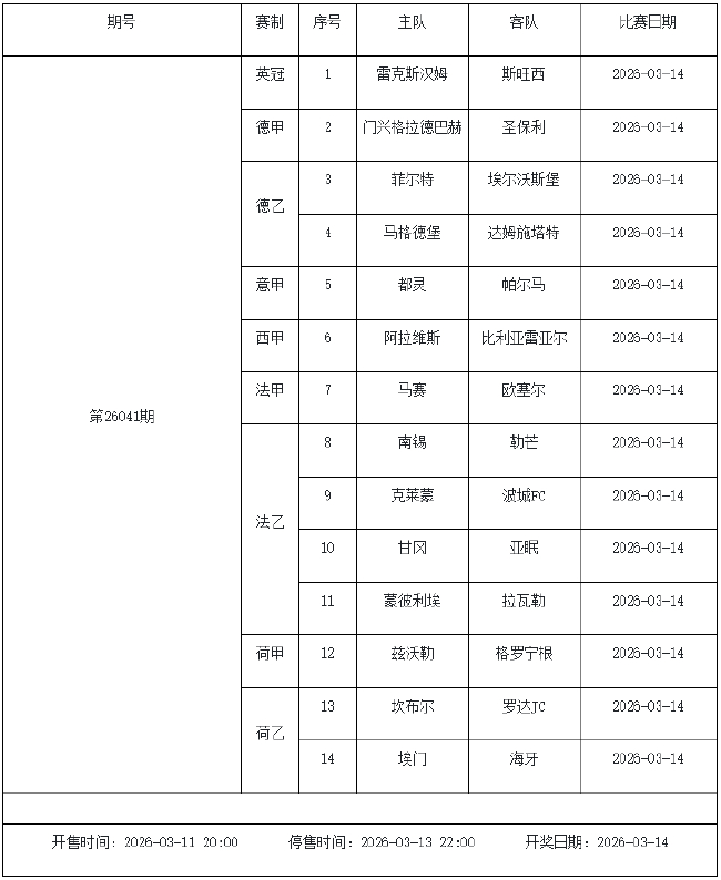 北京技艺2026年3月10日,国度体彩中心公布了2026年3月13日-3月19日的足彩赛程,3月13日(周五)、3月14日(周六)、3月15日(周日)、3月17日(周二)、3月19日(周四)共5期。其中26041期包含英冠德甲意甲西甲法甲等9大赛事混猜、第26042期、26043期由五大联赛构成、26044期竞猜欧冠欧罗巴英冠荷乙、26045期竞彩欧罗巴欧协联。