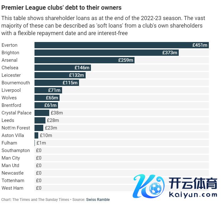 当今埃弗顿的鼓动贷款高达4.51亿英镑,高居英超第一,其次是布莱顿的3.73亿英镑和阿森纳的2.59亿英镑。
